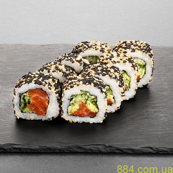 Відомий усім рол Каліфорнія тут отримав нову інтерпретацію: замість крабового м’яса — соковитий копчений лосось, а кунжут додає текстурності й легкого горіхового аромату. Внутрішня начинка з авокадо й огірка забезпечує свіжість, а копчений лосось дарує насичений, трохи солонуватий, вишуканий смак. Це поєднання ідеально збалансоване для тих, хто шукає щось знайоме, але з новим звучанням.